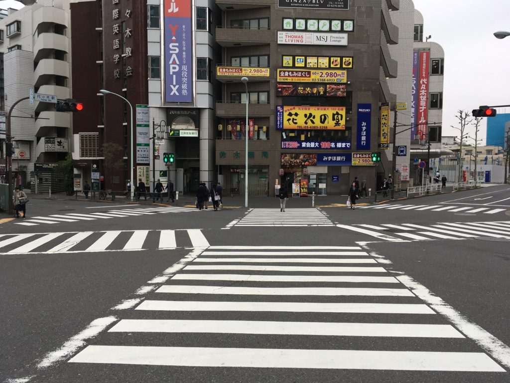 まずは駅前正面にあるスクランブル交差点を斜め方向へ渡ります。